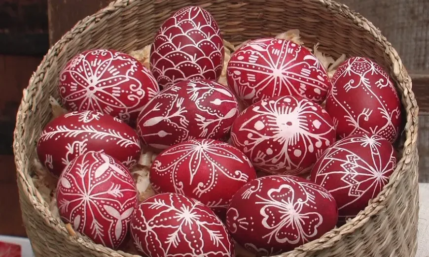 Типичното велинградско яйце е червено с бели орнаменти, изрисувано от край до край с помощта на специална писалка и восък.