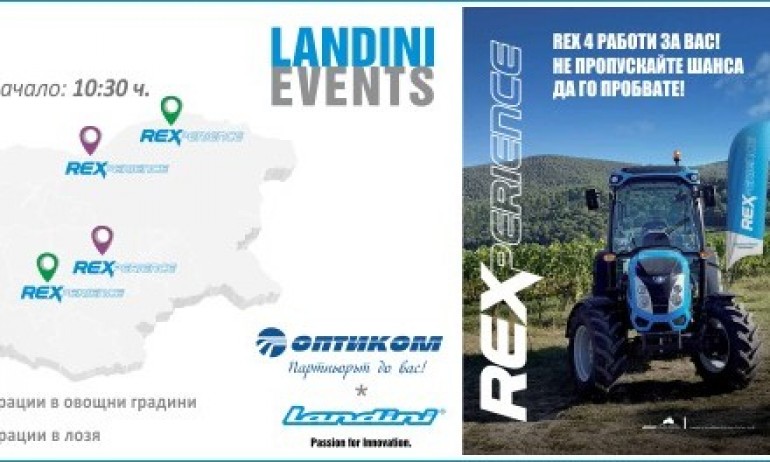 Световният тур REXperience (REXпреживяване) идва и в България, след като премина успешно през Молдова и Испания. REX-емоцията обещава да ни остави без дъх, както с хубави гледки, вина и специални изненади, така и с атрактивни демонстрации на специализираните трактори Landini REX в лозови масиви и градини с трайни насаждения.